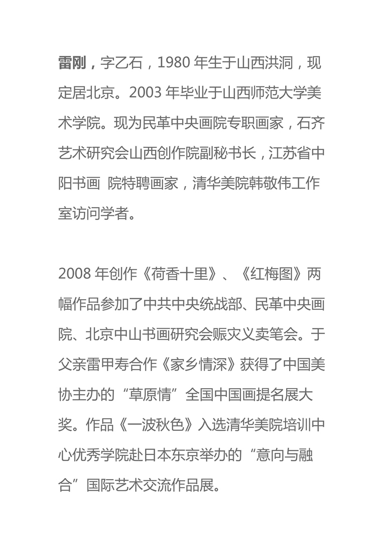 雷刚,字乙石,1980年生于山西洪洞,现定居北京。2003年毕业于山西师范大学美术学院。现为民革中央画院专职画家,石齐艺术研究会山西创作院副秘书长,江苏省中阳书画院特聘画家,清华美院韩敬伟工作室访问学者。