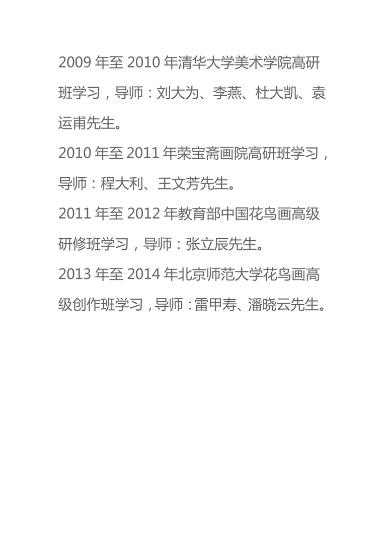 2011年至2012年教育部中国花鸟画高级研修班学习,导师:张立辰先生。